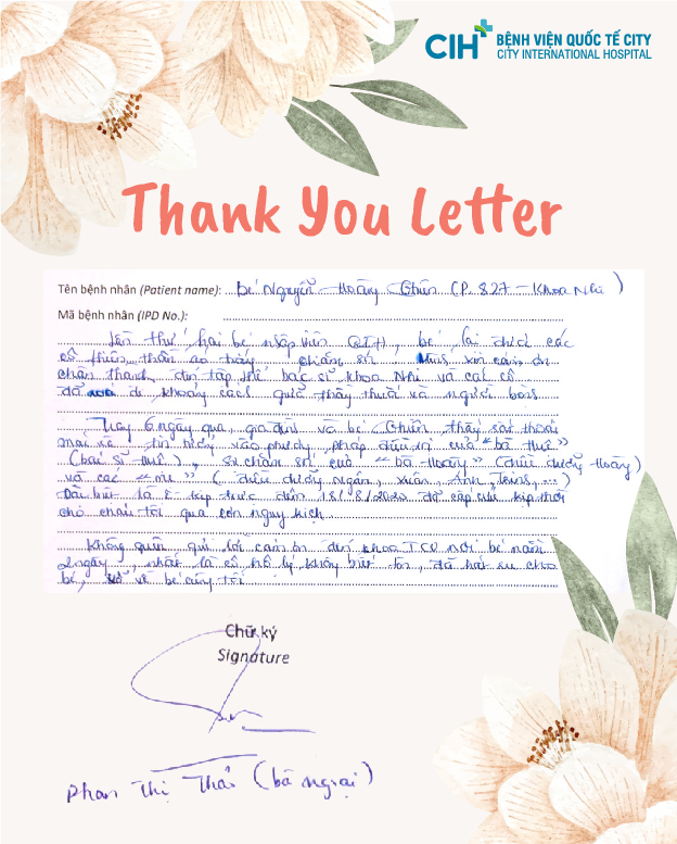 Bệnh viện Quốc tế City chân thành cảm ơn những tình cảm của gia đình dành cho đội ngũ bác sĩ, điều dưỡng của bệnh viện. Chúc bé và gia đình khỏe mạnh, an vui và hạnh phúc.