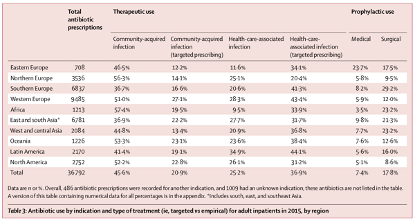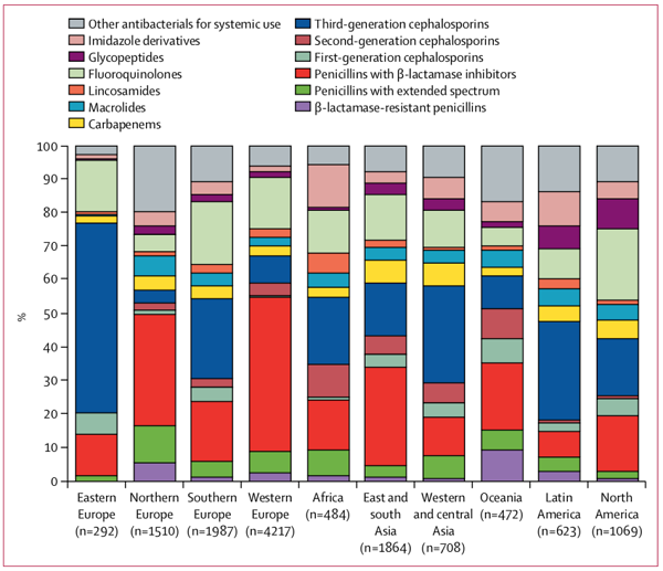 Sự kết hợp của penicillin với một chất ức chế β-lactamase là loại kháng sinh được chỉ định thường xuyên nhất trong khảo sát này, nhất là tại các nước khu vực Bắc Âu và Tây Âu (và đặc biệt là ở các bệnh viện tại Bỉ). Các loại cephalosporin thế hệ thứ ba, chủ yếu là ceftriaxone, là loại thuốc được chỉ định phổ biến nhất ở Châu Á, Châu Mỹ Latinh, và các nước thuộc khu vực phía nam và đông Châu Âu cho cả bệnh nhiễm trùng cộng đồng và nhiễm trùng liên quan đến chăm sóc. Việc sử dụng ceftriaxone thường xuyên ở những khu vực này cho thấy rằng có một tỷ lệ chỉ định kháng sinh không phù hợp.