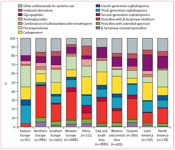 Tần suất sử dụng vancomycin cao đáng kể đã được ghi nhận ở các bệnh viện khu vực Bắc Mỹ và Châu Mỹ Latinh. Việc sử dụng vancomycin với tần suất cao này có thể được giải thích bởi tỷ lệ nhiễm Staphylococcus aureus kháng methicillin (MRSA) cao được báo cáo ở các bệnh viện khu vực Mỹ Latinh. Carbapenems, chủ yếu là meropenem, được sử dụng rộng rãi ở Châu Mỹ Latinh và Châu Á, do tần suất cao nhiễm trùng vi khuẩn Gram âm có lactamase mở rộng, đã được báo cáo trong các nghiên cứu giám sát trước đây.