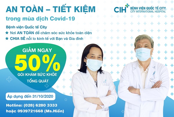 Hãy AN TÂM đến với Bệnh viện Quốc tế City, Bệnh viện AN TOÀN trong phòng ngừa dịch Covid-19 được chứng nhận bởi Sở Y tế TP.HCM. Hơn thế nữa, bệnh viện chúng tôi CHIA SẺ nỗi lo kinh tế với Bạn và Gia đình thông qua chương trình GIẢM 50% CÁC GÓI KHÁM SỨC KHỎE TỔNG_QUÁT”. Giá chỉ từ 1,550,000Đ.
