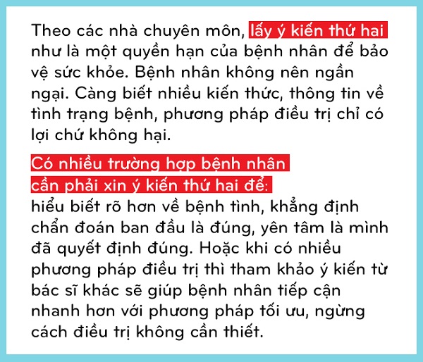 Khi quá nhiều phương pháp điều trị một lúc: việc tham khảo ý kiến chuyên môn từ bác sĩ khác sẽ giúp bệnh nhân tiếp cận nhanh hơn với phương pháp điều trị đúng, ngừng những cách điều trị không cần thiết.