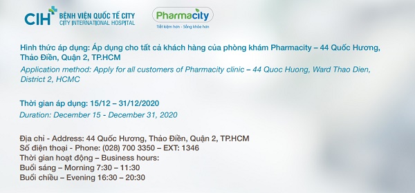 Phòng khám Pharmacity Quốc Hương tại Quận 2 với sự hợp tác giữa Bệnh viện Quốc tế City và Tập đoàn dược phẩm Pharmacity sẽ chính thức hoạt động trở lại từ 15/12/2020 với ưu đãi đặc biệt dành tặng khách hàng. Theo đó, trong thời gian từ 15/12 – 31/12/2020, khách đến khám sẽ được giảm 50% tiền khám.
