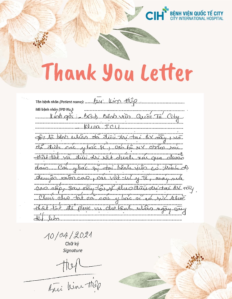 Ban lãnh đạo Bệnh viện Quốc tế City (CIH), đặc biệt là tập thể bác sĩ, điều dưỡng Khoa Hồi sức tích cực (ICU) gửi lời cảm ơn sâu sắc đến bệnh nhân đã dành những tình cảm tốt đẹp đến bệnh viện nói chung và khoa ICU nói riêng.