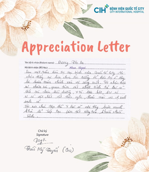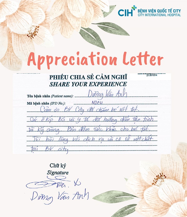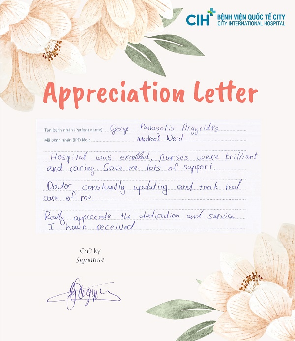 Bệnh viện Quốc tế City (CIH) gửi lời cảm ơn đến bệnh nhân và gia đình đã dành tình cảm, sự tin yêu đến bệnh viện trong suốt quá trình khám và điều trị. Sức khỏe của bệnh nhân, những sẻ chia của bệnh nhân và người thân đến bệnh viện sẽ là nguồn động lực để CIH không ngừng nâng cao chất lượng cao trong công tác khám chữa bệnh.