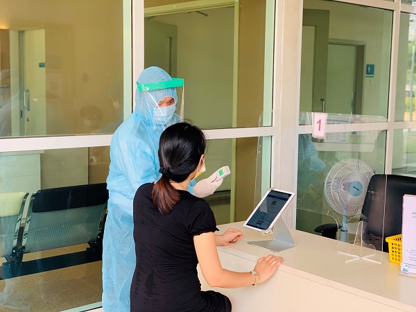 Ngay từ cổng chính, khách đến bệnh viện phải thực hiện khai báo y tế, kiểm tra thân nhiệt