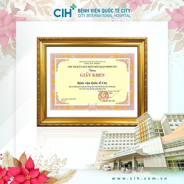 Ngày 14/03/2023, Bệnh viện Quốc tế City (CIH) đã vinh dự nhận được bằng khen từ Chủ tịch UBND Quận Bình Tân, khen tặng: “Có thành tích xuất sắc trong thực hiện đề án 06 của chính phủ năm 2022 trên địa bàn quận Bình Tân”.