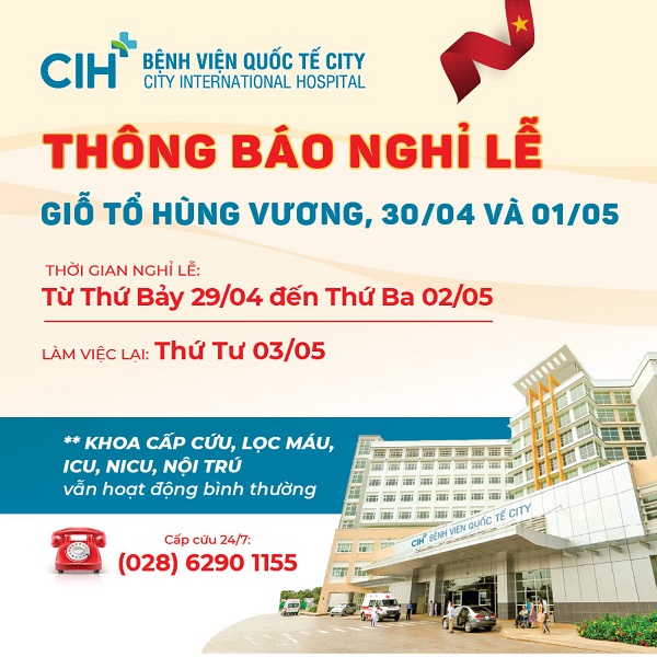Bệnh viện Quốc tế City (CIH) trân trọng thông báo lịch nghỉ Lễ Giỗ Tổ Hùng Vương, Giải phóng Miền Nam thống nhất Đất Nước 30/4 và Quốc tế Lao Động 1/5 như sau: