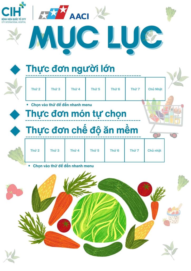 Để giúp bệnh nhân điều trị nội trú tại CIH nhanh hồi phục sức khỏe, Tổ Dinh Dưỡng Bệnh viện Quốc tế City đã lên thực đơn trong tuần cho người lớn và trẻ em.