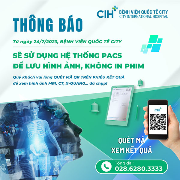 Thực hiện Đề án 06 của Chính phủ và xu thế phát triển chuyển đổi số bệnh án điện tử của ngành y tế, từ ngày 24/7/2023, Bệnh viện quốc tế City sẽ sử dụng hệ thống PACS để lưu hình, phim Chẩn đoán hình ảnh, KHÔNG IN PHIM.