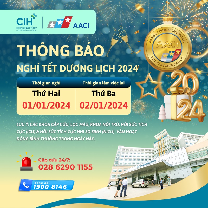 Chào đón năm mới 2023, Bệnh viện Quốc tế City (CIH) trân trọng thông báo Lịch nghỉ Tết Dương Lịch 2024 của bệnh viện như sau: