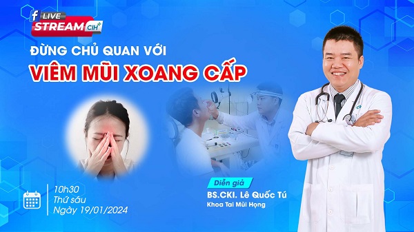 Viêm mũi xoang cấp là bệnh thường gặp, chiếm khoảng 30 triệu lượt thăm khám và chăm sóc ban đầu trên toàn cầu. Bệnh tuy lành tính nhưng nếu không điều trị đúng cách có thể tái đi tái lại nhiều lần, gây biến chứng nguy hiểm.Vậy viêm mũi xoang cấp có những triệu chứng nào và làm sao để phòng bệnh hiệu quả, kính mời quý khách hàng đón xem livestream với chủ đề “Đừng chủ quan với viêm mũi xoang cấp”
