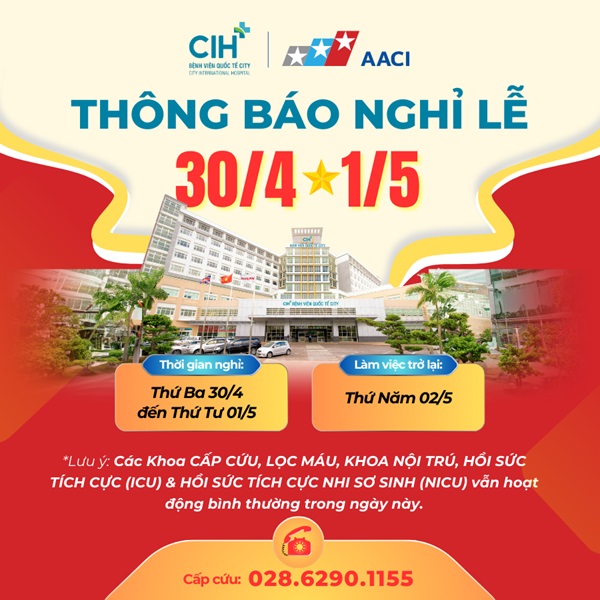 Chào mừng đại Lễ Giải phóng miền Nam – thống nhất Đất nước (30/4) và Quốc tế Lao động (01/5), Bệnh viện Quốc tế City (CIH) trân trọng thông báo Lịch nghỉ Lễ của bệnh viện như sau: