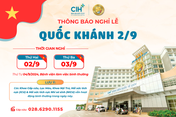 Mừng đại Lễ Quốc Khánh 02/9, Bệnh viện Quốc tế City trân trọng thông báo đến Quý khách thời gian nghỉ Lễ như sau: