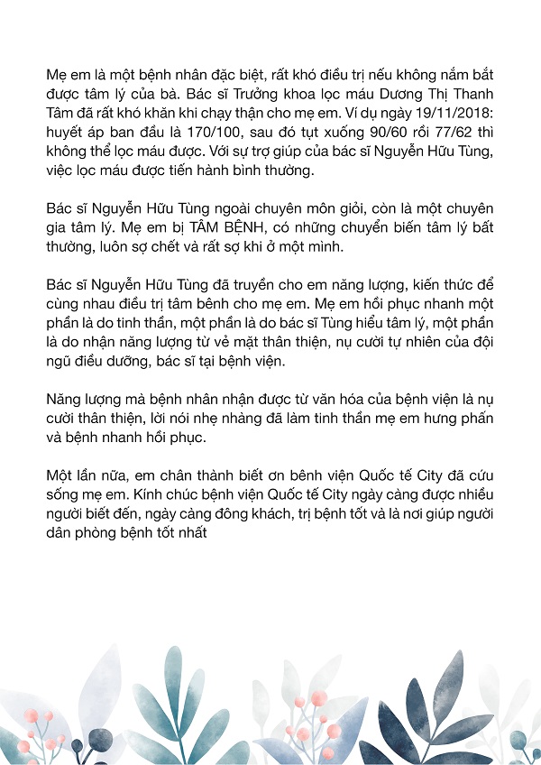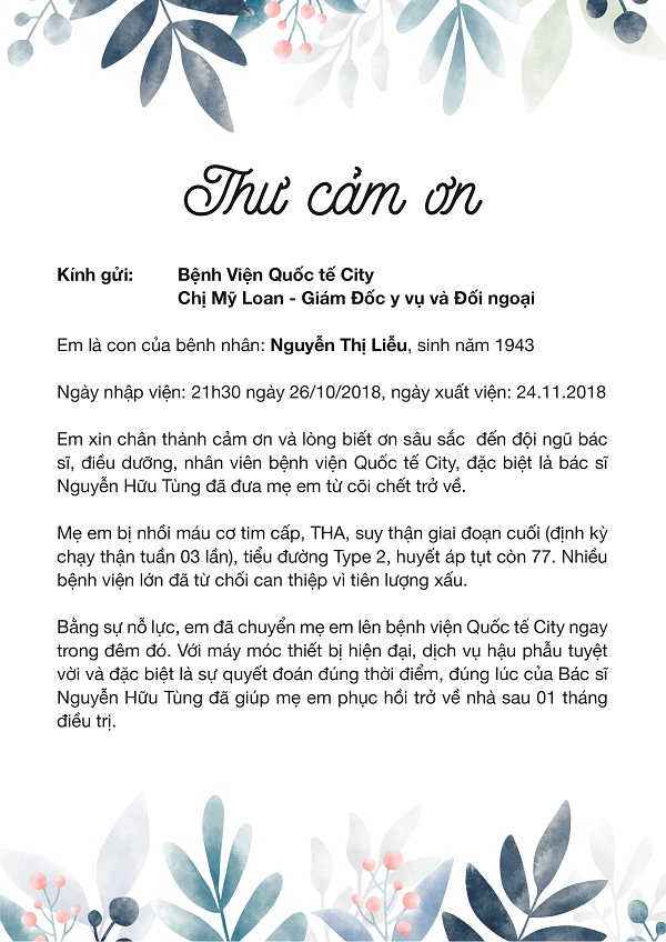 Ngay sau khi bệnh nhân xuất viện, người thân đã gửi thư cảm ơn đến bác sĩ, điều dưỡng và toàn thể nhân viên Bệnh viện Quốc tế City.