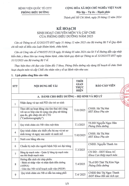 Đào Tạo CMEKẾ HOẠCH SINH HOẠT CHUYÊN MÔN VÀ CẤP CME CỦA PHÒNG ĐIỀU DƯỠNG NĂM 2025 Đăng vào Tháng 2 26, 2025 bởi Nguyen Han Đăng kí nhận thông tin Để luôn nhận được thông tin từ chúng tôi BÀI VIẾT LIÊN QUAN Kế hoạch sinh hoạt chuyên môn tháng 9 năm 2024 Kế hoạch sinh hoạt chuyên môn và cấp CME của phòng điều dưỡng năm 2024 Kế hoạch sinh hoạt chuyên môn tháng 12 năm 2024 Bệnh viện Quốc tế City là cơ sở khám bệnh, chữa bệnh đáp ứng yêu cầu là cơ sở hướng dẫn thực hành