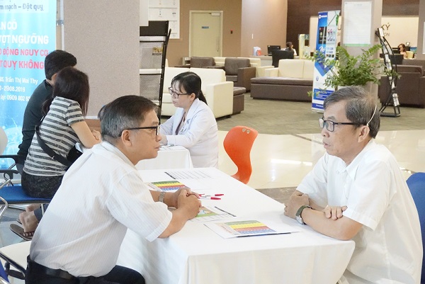 Bác sĩ Trần Thị Mai Thy và bác sĩ Huỳnh Hồng Châu tư vấn cho bệnh nhân về đột quỵ.