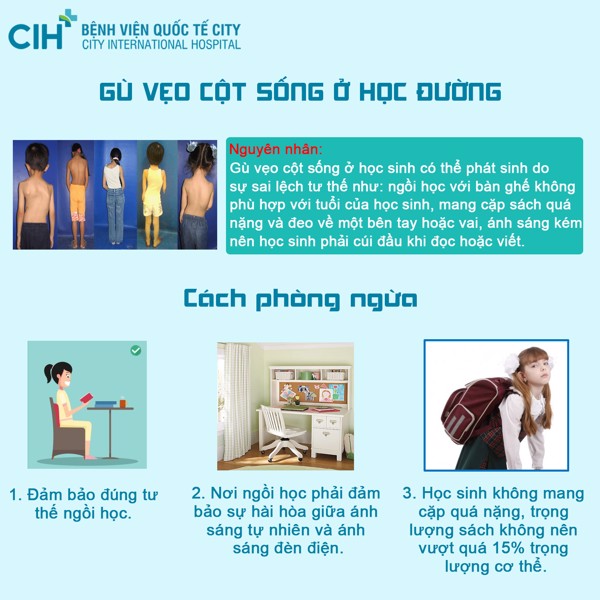 Gù vẹo cột sống ở tuổi học sinh có thể phát sinh do sự sai lệch tư thế như ngồi học không đúng tư thế, không ngay ngắn. Ngồi học với bàn ghế không phù hợp với tuổi của học sinh, mang cặp sách quá nặng và đeo về một bên tay hoặc vai, ánh sáng kém nên học sinh phải cúi đầu khi đọc hoặc viết.