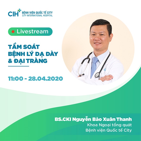 Vì vậy, trong chương trình City Care – Nhịp cầu sức khỏe của Bệnh viện Quốc tế City vào 28/04/2020, BS.CKI NGUYỄN BẢO XUÂN THANH – CHUYÊN KHOA NGOẠI TỔNG QUÁT sẽ tư vấn trực tuyến (livestream) cho quý khách những thông tin hữu ích về tầm soát, phòng ngừa và điều trị bệnh lý liên quan đến dạ dày, đại trực tràng.