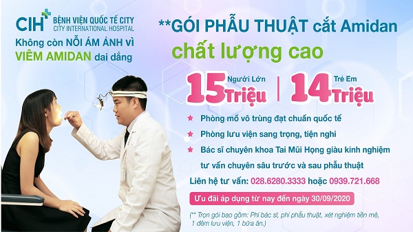Từ nay đến 30/09/2020, khi khách phẫu thuật cắt amidan tại Bệnh viện Quốc tế City sẽ được giảm ngay 2 triệu đồng. Trọn gói phẫu thuật cắt amidan chỉ 15 triệu cho Người lớn và 14 triệu cho Trẻ em. Liên hệ tư vấn: 0939721668
