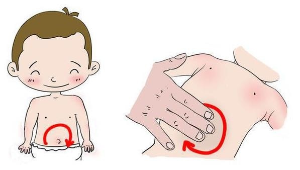 Dùng các ngón tay xoay tròn bụng bé theo chiều kim đồng hồ.