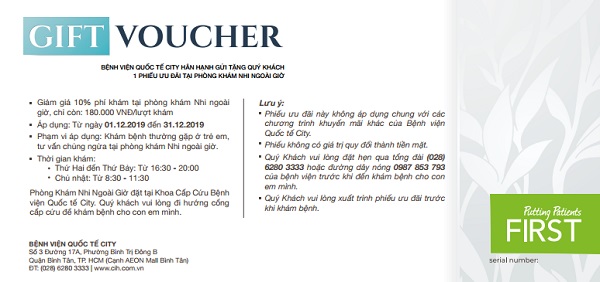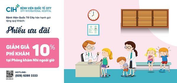 Bệnh viện Quốc tế City sẽ dành 30 SUẤT KHÁM MIỄN PHÍ CHO BÉ trong ngày khai trương Phòng khám Nhi ngoài giờ – 15/11/2019. Để đăng ký khám miễn phí cho bé, phụ huynh vui lòng gọi đến số 0987.853.793 để được tư vấn và hướng dẫn.