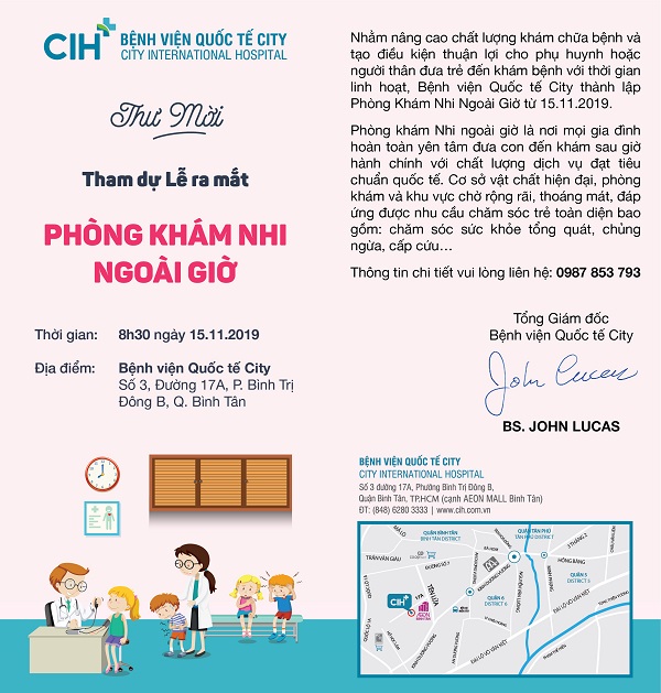 Từ ngày 15/11/2019, Bệnh viện Quốc tế City (CIH) sẽ khai trương Phòng khám Nhi ngoài giờ tại Khu vực Khoa Cấp cứu. Phụ huynh nếu không có thời gian đưa trẻ đi khám, chích ngừa trong giờ hành chính có thể đưa bé đến khám vào buổi tối tại phòng khám Nhi ngoài giờ của CIH.