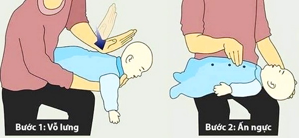 Sau khi làm xong nếu trẻ vẫn khó thở, tím tái, cha mẹ cần đặt bé nằm ngửa, dùng hai ngón trỏ ấn nhanh, mạnh, đột ngột vào xương ức để đẩy dị vật ra.