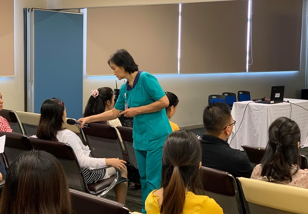 Cô Hà Thị Mai – Nữ hộ sinh trưởng Bệnh viện Quốc tế City đã hướng dẫn tư thế cho bé bú đúng cách, nuôi con bằng sữa mẹ đặc biệt là cho bé bú những giọt sữa non đầu đời.