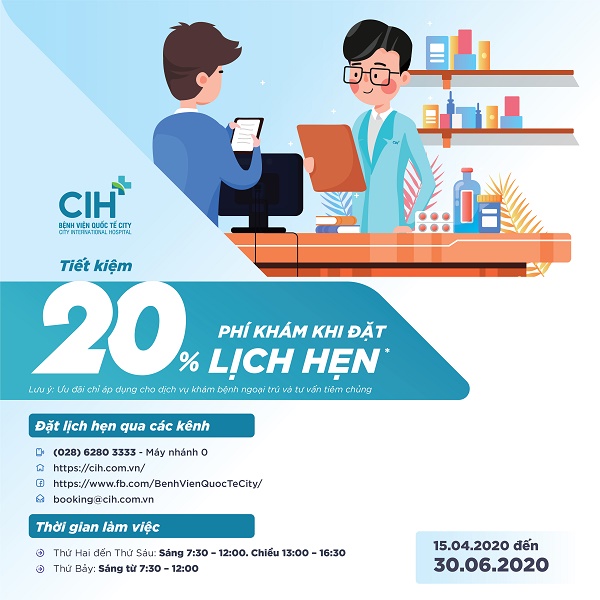 Tất cả bệnh nhân khám bệnh ngoại trú CÓ ĐẶT HẸN TRƯỚC thông qua các kênh đặt lịch hẹn bên dưới sẽ nhận được ưu đãi “GIẢM 20% PHÍ KHÁM BỆNH NGOẠI TRÚ”.