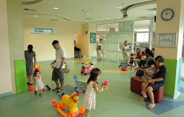 Không gian vui chơi rộng rãi, thoáng mát sẽ giúp bé luôn vui vẻ, thoải mái khi đến khám – chích ngừa. Các Hoạt Động KhácNhi khoa sơ sinh: tầm soát dị tật bẩm sinh, kiểm tra trước khi xuất viện, theo dõi và tái khám theo lịch và chủng ngừa theo định kỳ. Nhi khoa tổng quát: khám tổng quát và tiêm chủng, điều trị các bệnh lý thông thường ở trẻ em. Nhi khoa chuyên sâu về: hô hấp, tim mạch, thần kinh, thận niệu. Cấp cứu, hồi sức nhi chuyên sâu: hồi sức hô hấp, tuần hoàn, thần kinh… Các hoạt động kỹ thuật cao hỗ trợ điều trị: nội soi tiêu hoá, siêu âm màu, X-quang tại giường, điện tâm đồ nhi, vật lý trị liệu nhi.… Điều trị nội, ngoại khoa các bệnh bẩm sinh hay mắc phải ở trẻ em. Tư vấn tiền sản những vấn đề liên quan đến dị tật bẩm sinh của thai nhi. Bà mẹ được hướng dẫn sẽ làm gì khi phát hiện con mình có một bất thường ngay trong thời kỳ còn trong bụng mẹ. Điều trị phẫu thuật những dị tật tắc nghẽn đường tiêu hóa ngay sau sinh như teo ruột, tắc ruột, không có hậu môn. Điều trị phẫu thuật những dị tật không cấp cứu thuộc đường tiêu hóa, gan mật như bệnh Hirschsprung, teo đường mật, nang ống mật chủ…. Khám, tư vấn và điều trị tất cả những bệnh và dị tật đường tiết niệu, sinh dục trẻ em như hẹp bao quy đầu, thoát vị bẹn, tràn dịch tinh mạc, tinh hoàn ẩn, lỗ tiểu thấp, thận ứ nước và các dị tật sinh dục khác ở nam và nữ, các trường hợp mơ hồ giới tính.