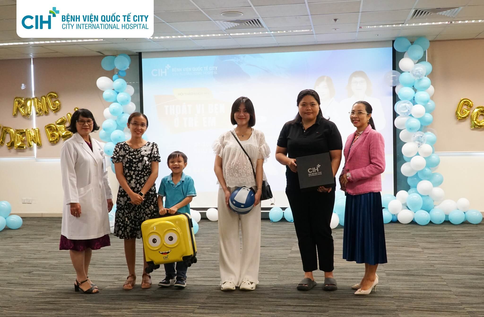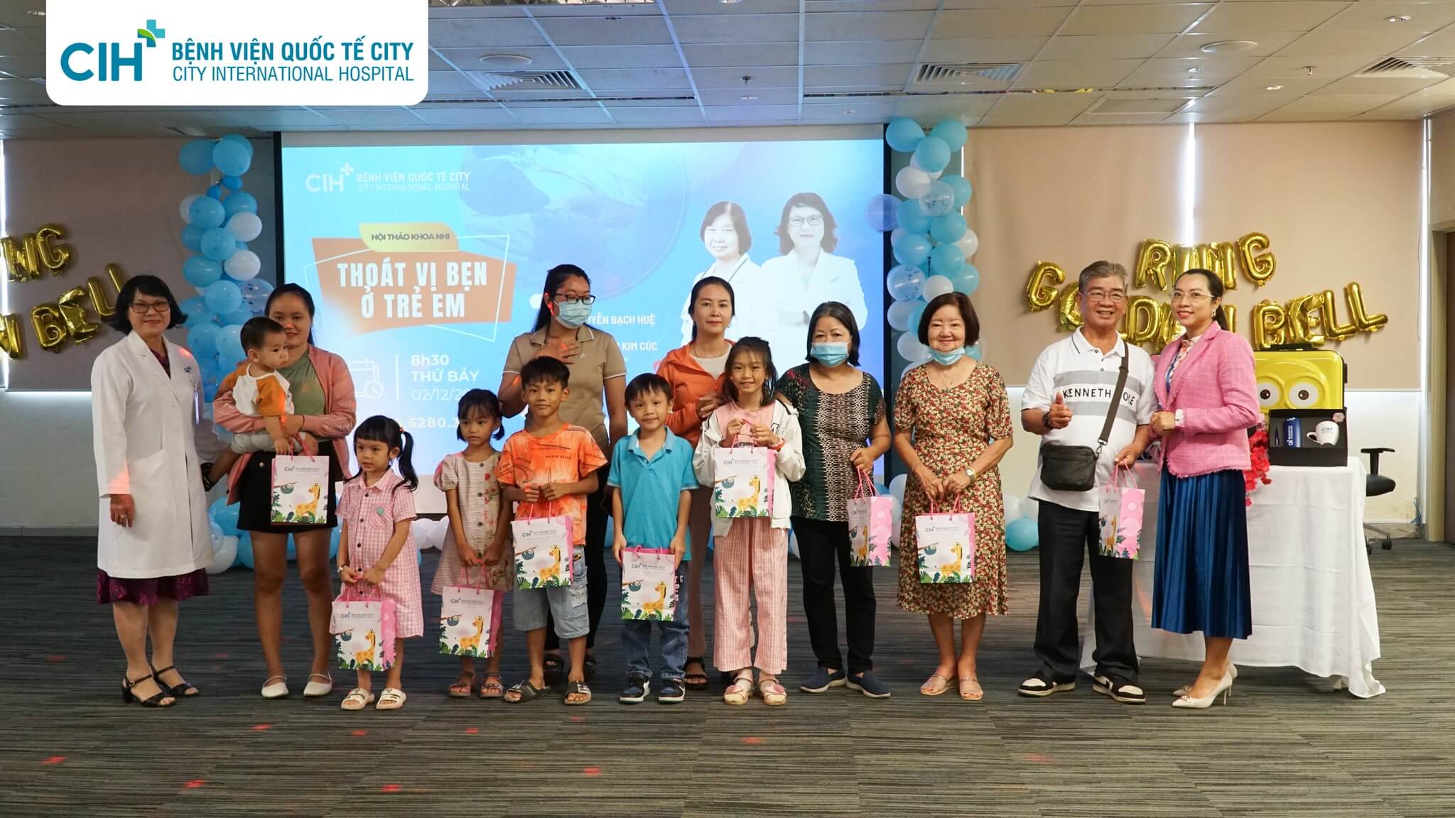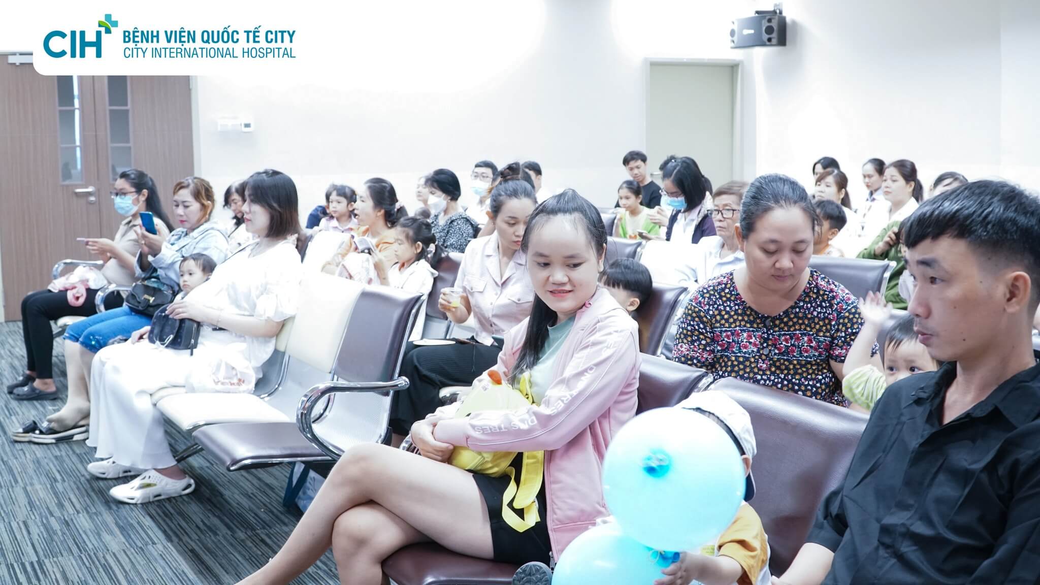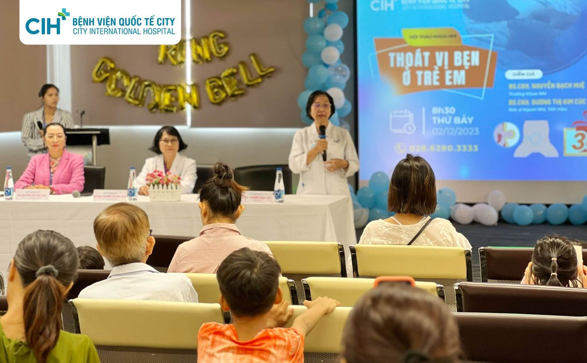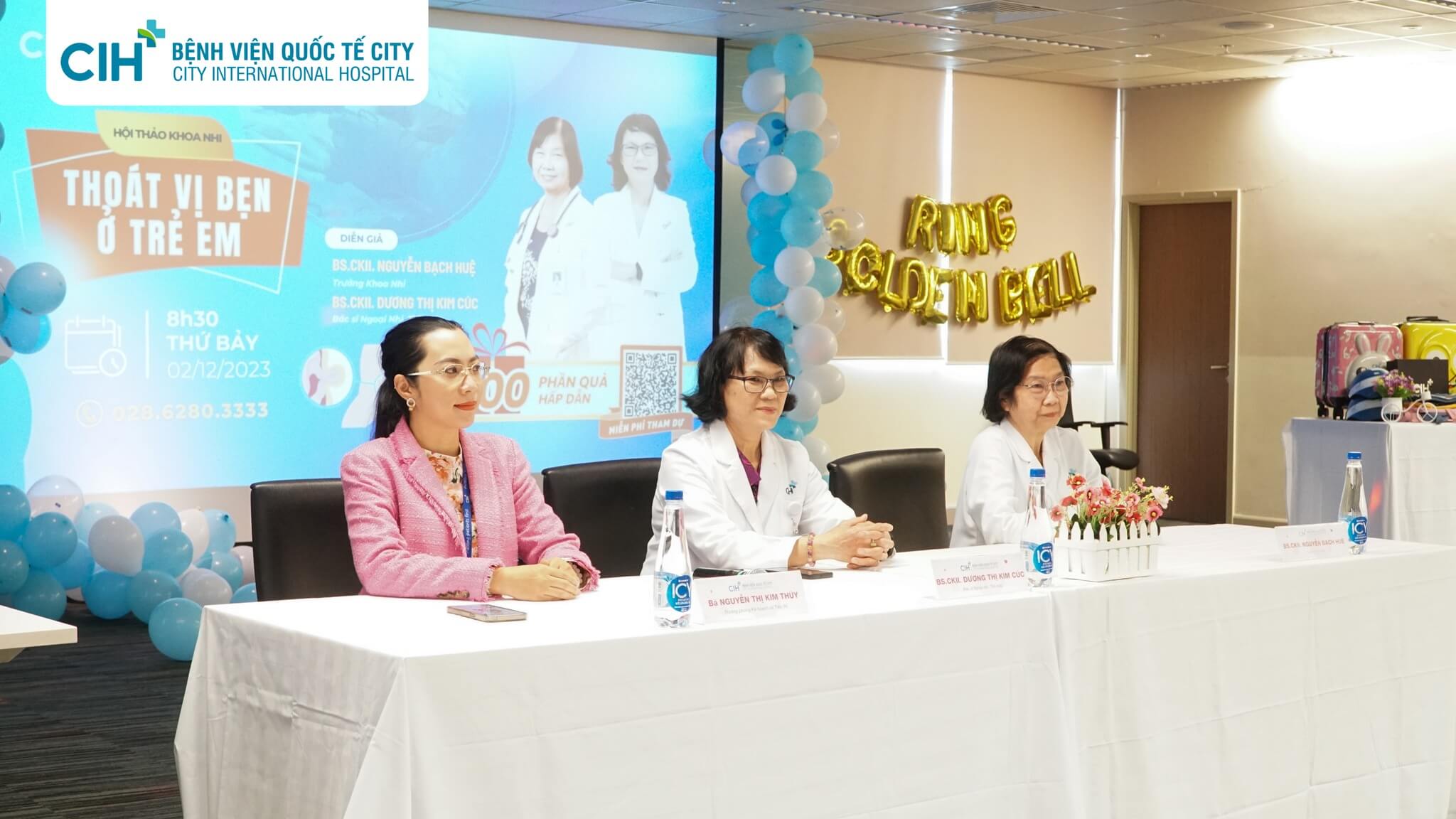 Hội thảo Thoát vị bẹn ở trẻ do Bệnh viện Quốc tế City (CIH) tổ chức sáng nay, ngày 02/12/2023 đã thu hút sự quan tâm của bố mẹ với gần 60 khách tham dự. Đại diện CIH có BS.CKII. Nguyễn Bạch Huệ – Trưởng Khoa Nhi, BS.CKII. Dương Thị Kim Cúc – BS ngoại nhi, tiết niệu, Bà Nguyễn Thị Kim Thúy – Trưởng Phòng Kế hoạch và Tiếp thị.