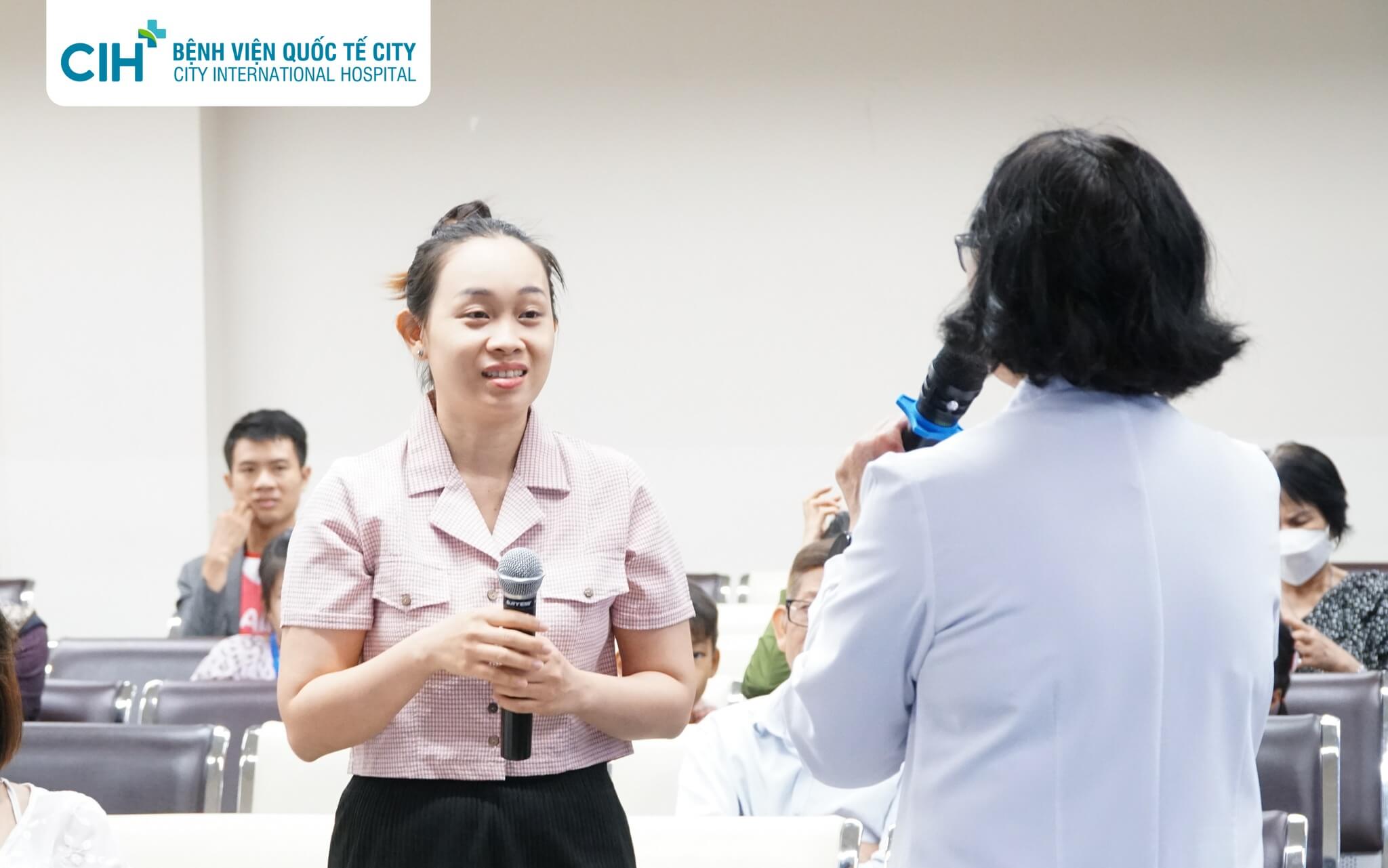 Sau phần báo cáo, rất nhiều thắc mắc, lo lắng của phụ huynh được bác sĩ Cúc giải đáp chi tiết, cặn kẽ. Có những ông bố không kìm nén được sự xúc động, nghẹn lời khi con mình 9 tháng tuổi đang gặp vấn đề về sức khỏe, hay có người mẹ tay bồng con nhỏ lo lắng sợ con có nguy cơ của thoát vị bẹn. Rất nhiều cảm xúc bố mẹ được tỏ bày qua những câu hỏi gửi đến bác sĩ Cúc. Sau phần tư vấn tận tình của bác sĩ Cúc, bố mẹ cảm thấy yên tâm hơn trong hành trình chăm sóc sức khỏe cho con yêu.