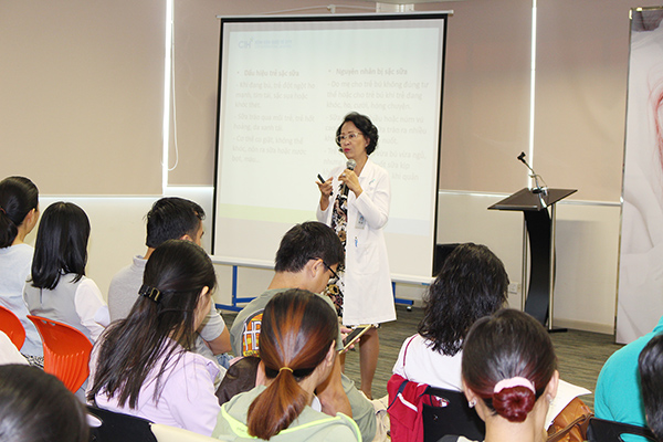 Chia sẻ chủ đề này tại hội thảo, BS. Trần Thị Kim Xuyến, Trưởng khoa Sản của bệnh viện Quốc tế City đã giúp các mẹ hiểu về tư thế cho bé bú mẹ đúng cách, cấp cứu khi bé sặc sữa, cách trữ đông, rã đông sữa.