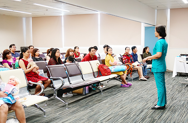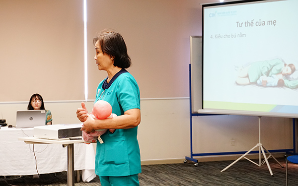 Sau phần tư vấn của Bác sĩ Xuyến, các bố mẹ được nghe cô Hà Thị Mai – Điều dưỡng trưởng Khoa Phụ Sản chia sẻ về kinh nghiệm cho bé bú: cho bé bú như thế nào là đúng cách, cách sơ cứu khi bé sặc sữa… Những chia sẻ của Cô Mai mang lại nhiều thông tin hữu ích cho khách hàng, đặc biệt là những ai lần đầu làm mẹ.