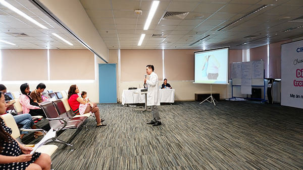 Sáng ngày 13/10, chương trình Tiền sản “Dinh dưỡng trong thai kỳ” chào đón gần 60 mẹ bầu tham gia. Hiểu được những băn khoăn của mẹ bầu về chế độ dinh dưỡng như thế nào là khoa học, hợp lý theo từng giai đoạn phát triển của trẻ nên BS Quách Văn – Khoa Phụ Sản Bệnh viện Quốc tế City đã có những chia sẻ rất cụ thể, tận tình.