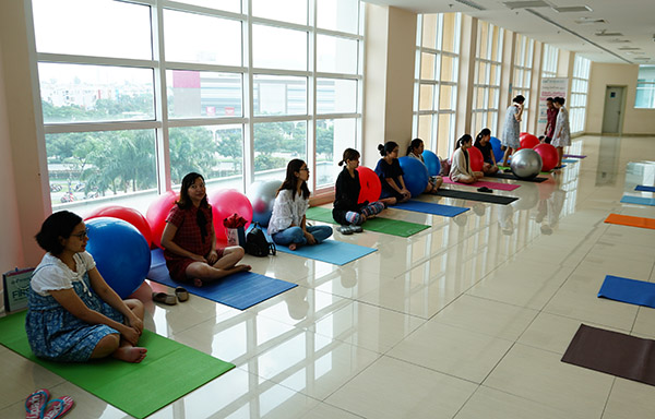 Bên cạnh thông tin hữu ích từ bác sĩ, mẹ bầu còn được thư giãn qua các bài tập yoga tăng cường sức khỏe cho phụ nữ mang thai qua sự hướng dẫn của chị Đào Thị Thùy Loan – kỹ thuật viên yoga kiêm điều dưỡng Bệnh viện Quốc tế City.