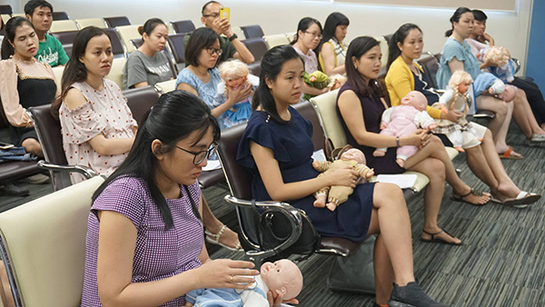 Nhiều mẹ bầu hào hứng tham gia thực hiện sơ cứu cho bé khi bị sặc sữa.
