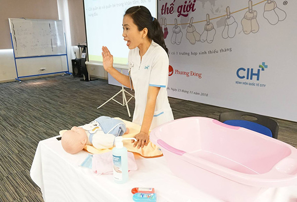 Ngoài ra, Cô Hà Thị Mai – Điều dưỡng trưởng Khoa Sản và điều dưỡng Đào Thị Thúy Loan cũng hướng dẫn mẹ bầu cách tắm, chăm sóc vùng rốn cho bé sơ sinh cũng như tập cho mẹ bầu sơ cứu tại nhà khi bé bị sặc sữa. Qua đó mẹ bầu cảm thấy yên tâm và tự tin hơn khi chăm sóc thiên thần nhỏ.