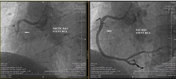 Sau khi tiến hành hội chẩn liên chuyên khoa giữa bác sĩ can thiệp Tim mạch và Hồi sức tích cực, bệnh nhân có chỉ định chụp động mạch vành khẩn. Thủ thuật được thực hiện bởi Ths.Bs Nguyễn Hữu Tùng – Trưởng Khoa Tim mạch Can thiệp Bệnh viện Quốc tế City và ekip can thiệp mạch. Bệnh nhân được xác định tắc hoàn toàn động mạch vành phải và được đặt 1 stent RCA2. Sau can thiệp động mạch vành được tái thông, nhưng tình trạng rối loạn nhịp không cải thiện, bệnh nhân bị block nhĩ thất 2:1, nguy cơ bị đột tử do rối loạn nhịp tim nặng.