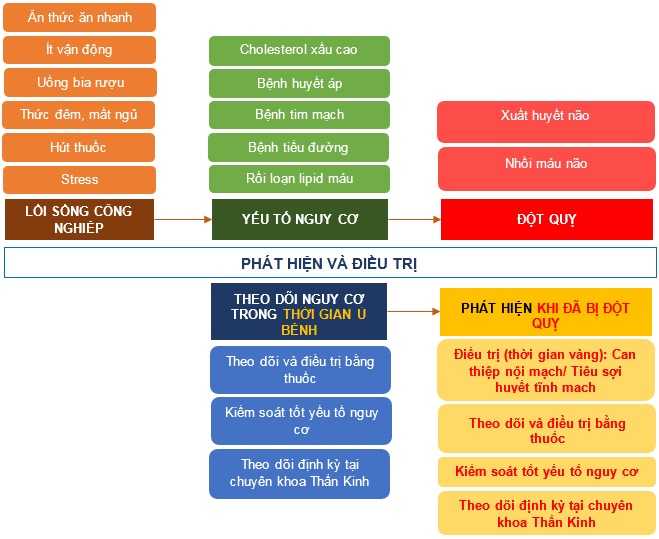 Lối sống công nghiệp như ăn thức ăn nhanh, ít vận động, uống bia rượu, thức đêm nhiều, mất ngủ, hút thuốc, dùng các các chất kích thích… làm tăng lượng cholesterol “xấu” trong máu gây ra các mảng xơ vữa trong mạch máu, tạo cục máu đông. Đồng thời, đối với những người lớn tuổi, cũng gây thêm các bệnh lý về tim mạch, tiểu đường, cao huyết áp… thúc đẩy nhanh quá trình dẫn đến Đột Quỵ.