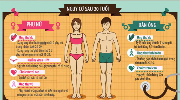 Hơn nữa, người ở độ tuổi 20 còn tiếp xúc với nhiều môi trường khác nhau, tỷ lệ truyền nhiễm các loại viêm gan, bệnh đường tiêu hóa và bệnh truyền nhiễm lây qua đường tình dục tăng cao. Các chuyên gia cũng khuyến cáo chụp X-quang vùng ngực để kiểm tra lao phổi bởi bệnh này thường thấy ở người trẻ tuổi.