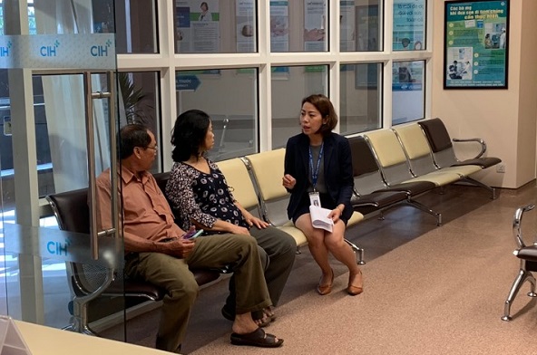 Bệnh nhân đang được nhân viên tư vấn phương pháp chiếu laser tĩnh mạch.