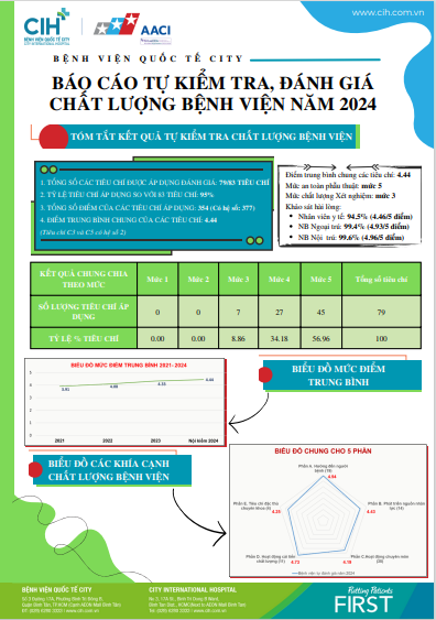 Căn cứ Quyết định 3652/QĐ-BYT ngày 03/12/2024 của Bộ Y tế về ban hành nội dung kiểm tra, đánh giá chất lượng bệnh viện và khảo sát sự hài lòng người bệnh, nhân viên y tế năm 2024-2025 và Kế hoạch số 28/KH-SYT ngày 03/01/2025 của Sở Y tế TP. Hồ Chí Minh về kế hoạch kiểm tra, đánh giá chất lượng bệnh viện và khảo sát hài lòng người bệnh, nhân viên y tế năm 2024, Bệnh viện Quốc tế City đã tiến hành nội kiểm chất lượng Bệnh viện năm 2024 nhằm kiểm tra, đánh giá nội bộ việc thực hiện các hoạt động chuyên môn, cải tiến chất lượng, tình hình cung cấp dịch vụ khám, chữa bệnh của Bệnh viện trong năm 2024 theo các quy chế của Bộ Y tế, công văn hướng dẫn của Sở Y tế, các quy định/ quy trình của Bệnh viện, Tiêu chuẩn chất lượng cơ bản đối với Bệnh viện và Bộ 83 Tiêu chí đánh giá chất lượng bệnh viện Việt Nam của Bộ Y tế để có thêm dữ liệu phục vụ cho hoạt động cải tiến liên tục của Bệnh viện. Kết quả cụ thể như sau: